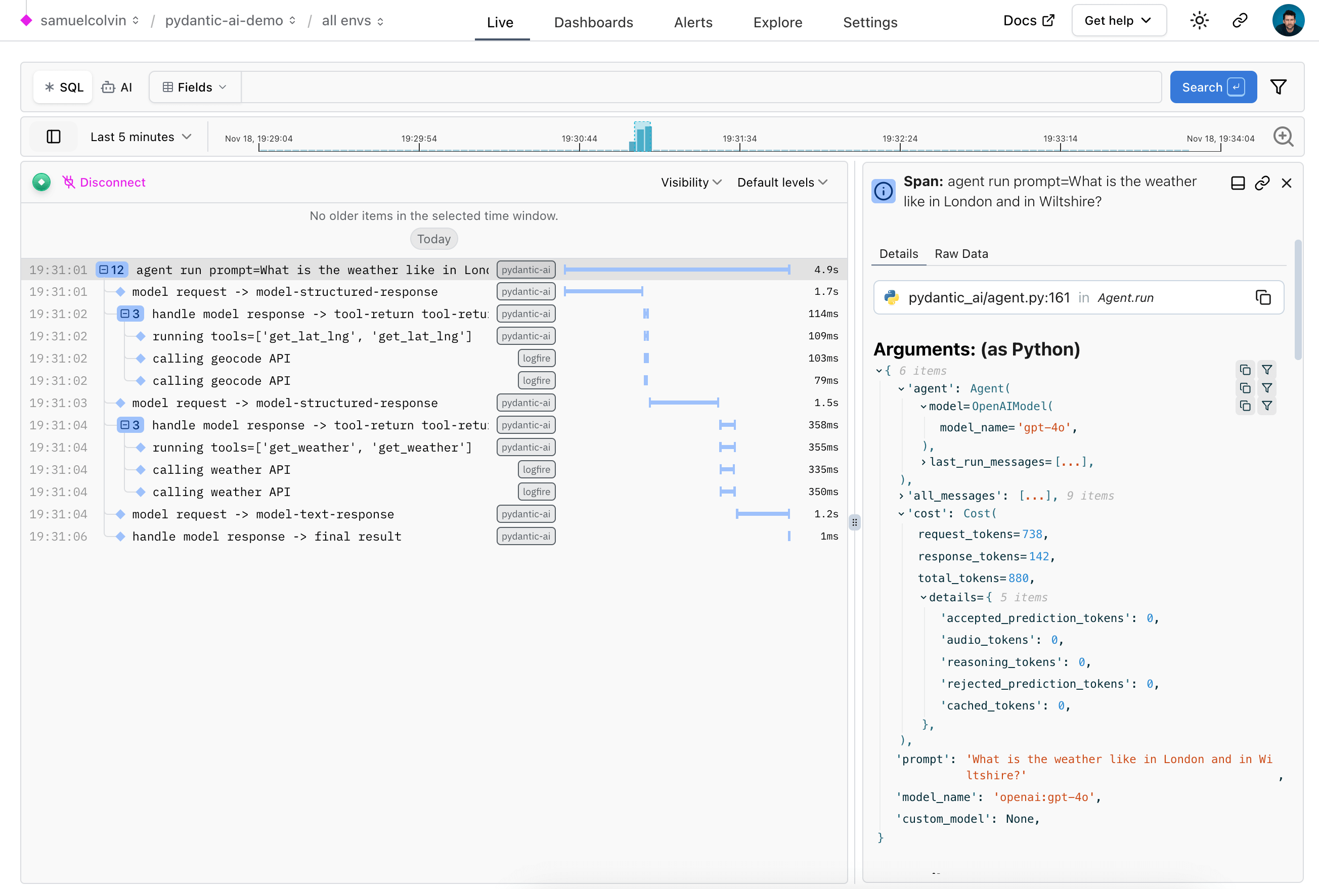 Pydantic Logfire is an observability platform from the developers of Pydantic and PydanticAI, that aims to let you understand your entire application: Gen AI, classic predictive AI, HTTP traffic, database queries and everything else a modern application needs.